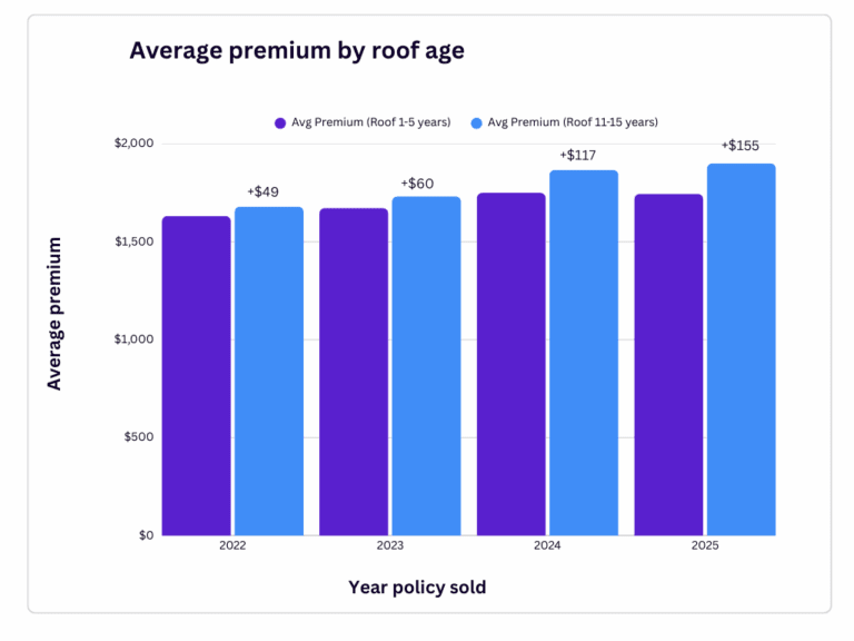 Matic’s year-end data shows that the premium gap between newer roofs and those 11–15 years old has widened consistently since 2022. In 2022, the difference between homes with roofs under five years old and those 11–15 years old was $49. By 2025, that gap had grown to $155. This shift highlights how much weight roof age now carries in pricing, even before a roof is considered “old” by underwriting standards.